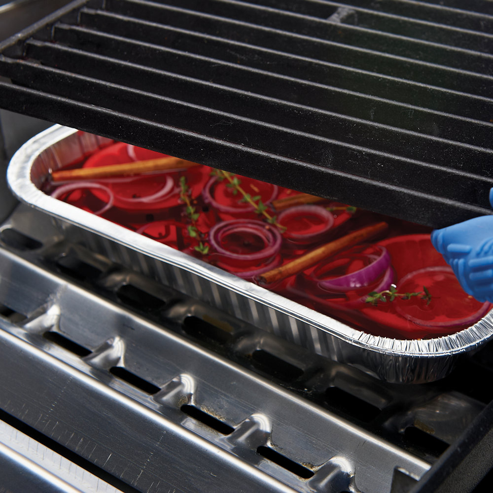 Füllen Sie Kräuter, Gewürze und/oder Bier in die Aluschale um Ihrem Grillgut während des Grillens ein besonderes Aroma zu verleihen.