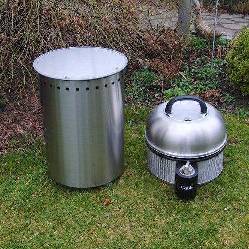 Der Zylinder aus Edelstahl dient zur Aufbewahrung der Gasflasche, auf dem angebrachten Deckel kann der COBB Gasgrill in bequemer Arbeitshöhe abgestellt werden!