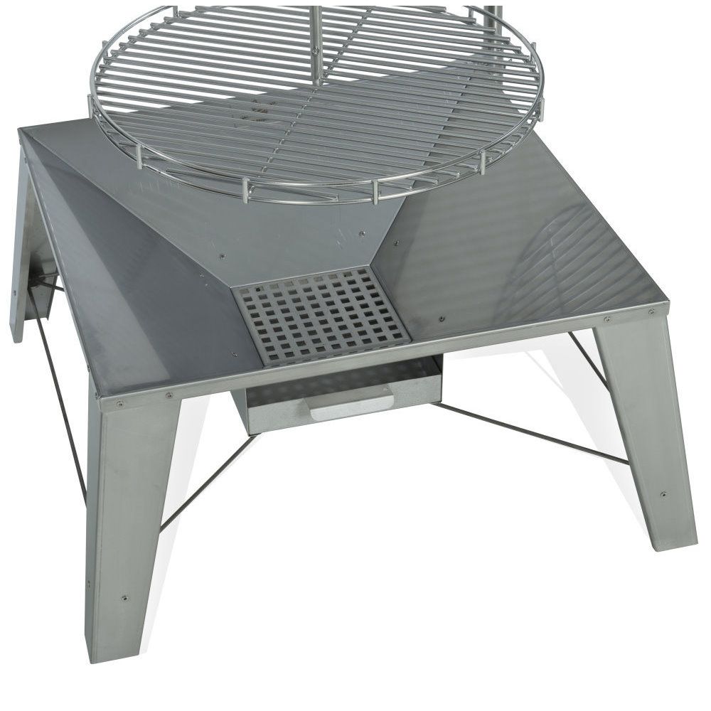 Diese sehr komfortable Feuerstelle mit Aschenschublade und Feuerrost aus hochwertigem, rostfreiem Stahl ermöglicht einen optimalen Abbrand des Grillholzes durch die Belüftung von unten (Kaminzugeffekt).