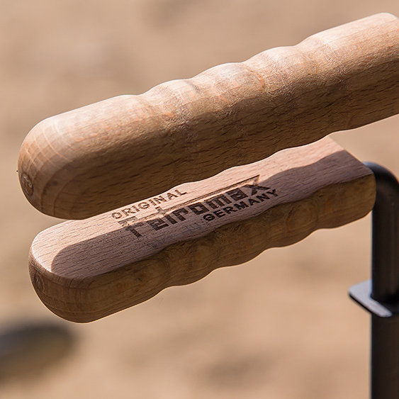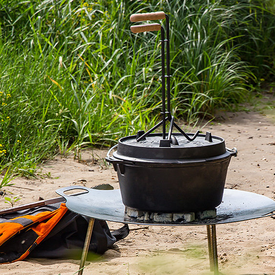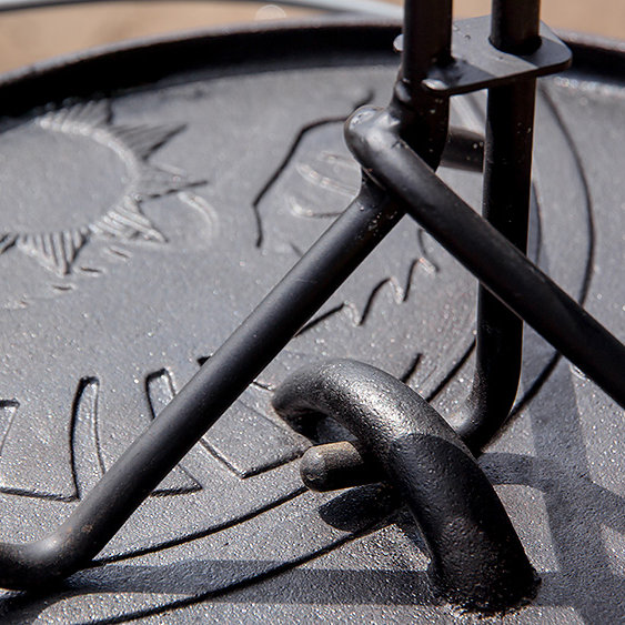 Dank seiner beiden extra Standfüße ist der Profi-Deckelheber jederzeit neben Feuertopf oder Grill in Griffweite des Outdoor-Kochs. Die Füße dienen zudem als zusätzliche Sicherung, sodass der schwere heiße Deckel beim Abheben gut kontrolliert werden kann.