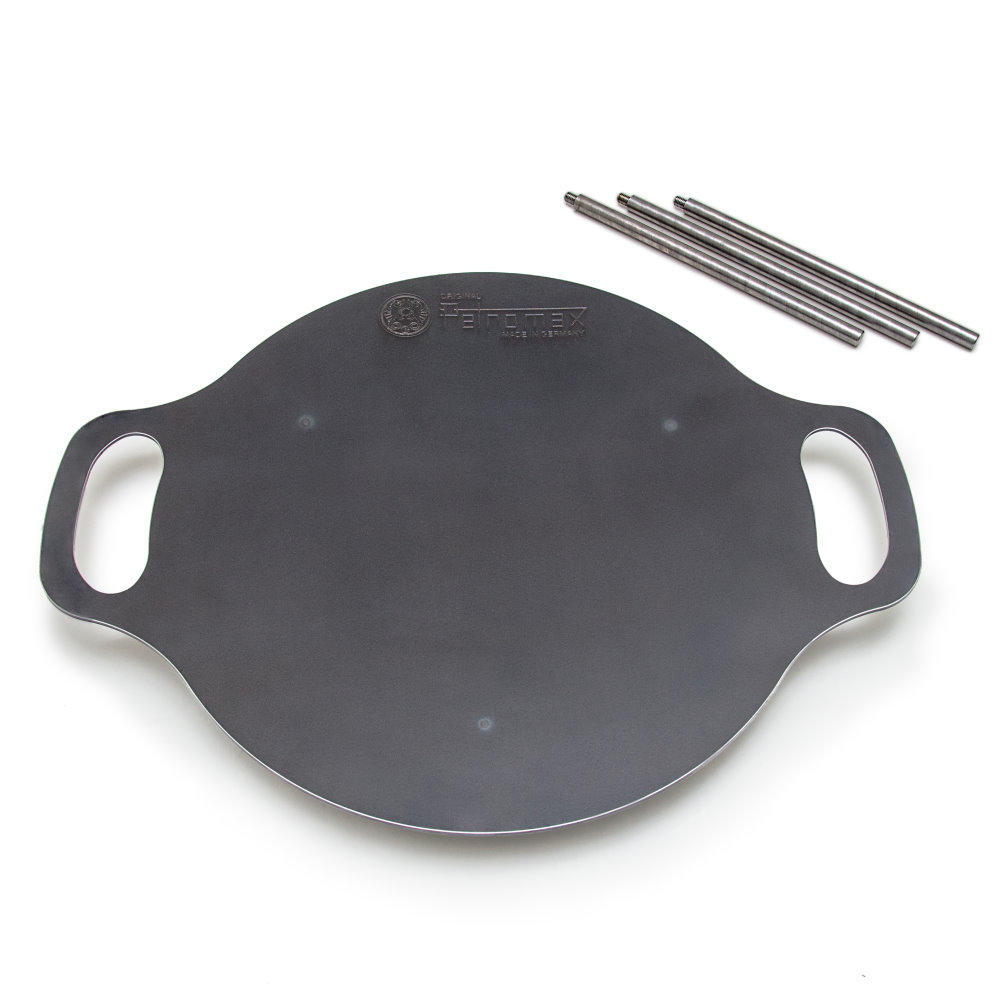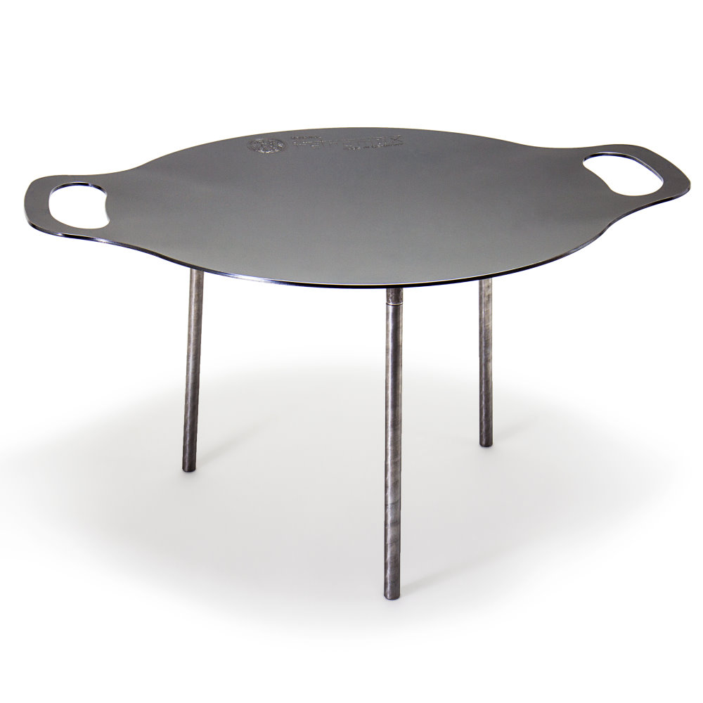 Mit den drei Standbeinen steht die Grill- und Feuerschale sicher über dem offenen Feuer. In der Mitte wird sie heißer als am äußeren Rand, sodass du dort Steaks, Backwaren und Co. warm halten kannst, während in der Mitte noch das Gemüse brutzelt. Vor dem ersten Gebrauch wird die Grillplatte eingebrannt, sodass sich bei jedem weiteren Brat- und Brennvorgang eine Patina bildet, die für einen natürlichen Antihafteffekt sorgt. Einmal eingebrannt wird die Platte sehr schnell heiß und du kannst direkt mit dem Grillen beginnen.